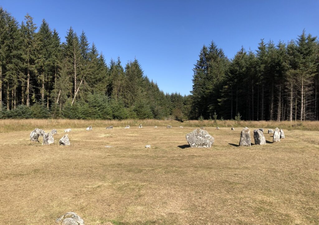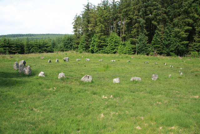 A fine Bronze Age Stone Circle of 27 granite slabs and blocks that stand in a clearing on a plateau of land within a Forestry Commission plantation about half a mile west of Fernworthy reservoir. A pair of small stones mark a southern entrance which are flanked by larger stones, the tallest being about 1.1 metres tall, with the stones decreasing in size as they curve round to the north forming a ring of about 20 metres in diameter that is slightly flattened to the east and west. The circle was excavated by the Dartmoor Exploration Committee in 1897 who reported a layer of charcoal within the circle but no other finds.