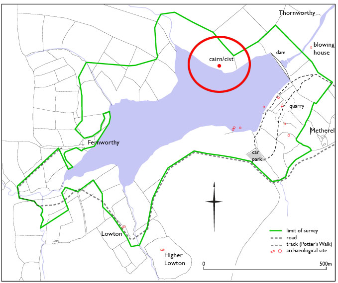Fernworthy reservoir cist. This burial chamber known as the Thornworthy Tor Cist is located very close to the north edge of the reservoir.